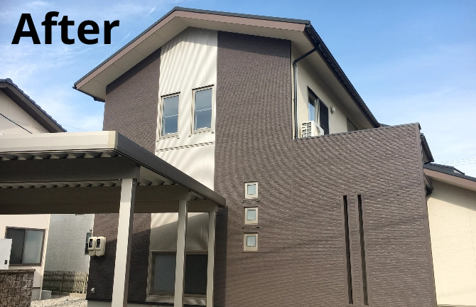 お家が海に近く角地ということもあり、外壁にはところどころ爆裂が発生し素地が見えてしまっている状態でした。今回は耐久性の高いガルバリウム鋼板にフッ素焼付塗装を施した「はる一番」を施工し、耐久性だけでなく美観も長期間維持できる外壁に生まれ変わりました。